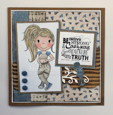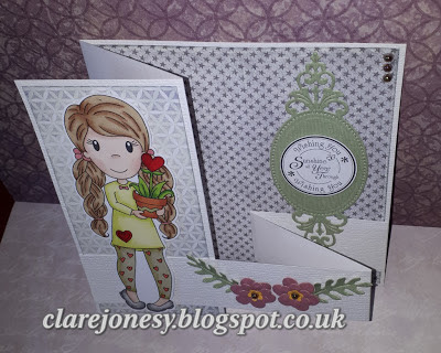The sweet focal character has been coloured wonderfully, with lovely soft tones and eye-catching details. Her sparkly glasses and coordinating outfit add so much charm, making her the perfect centrepiece for the design.